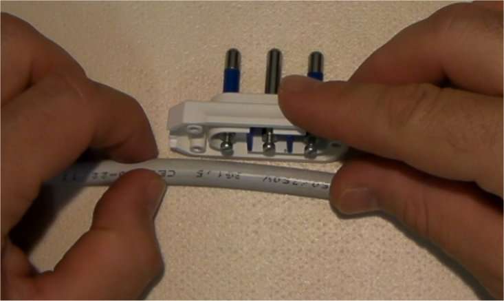 Nella seguente descrizione abbiamo utilizzato una spina detta a pipa, a 90° o piatta. Questa forma permette una riduzione dell’ingombro ed è particolarmente adatta per essere posizionata dietro i mobili o comodini. Rimuovere le viti della spina per accedere ai morsetti dei contatti.