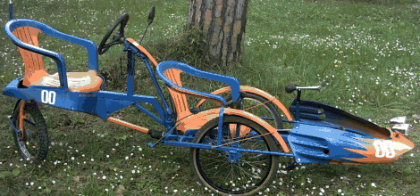 Si porta in 2, quello dietro guida e quello davanti pedala. Ha lo sterzo come un muletto, quindi riesce a girare su se stesso. Il muso è il codone dello scooter aprilia SR 50 e la coda è quella del cagiva mito 125.